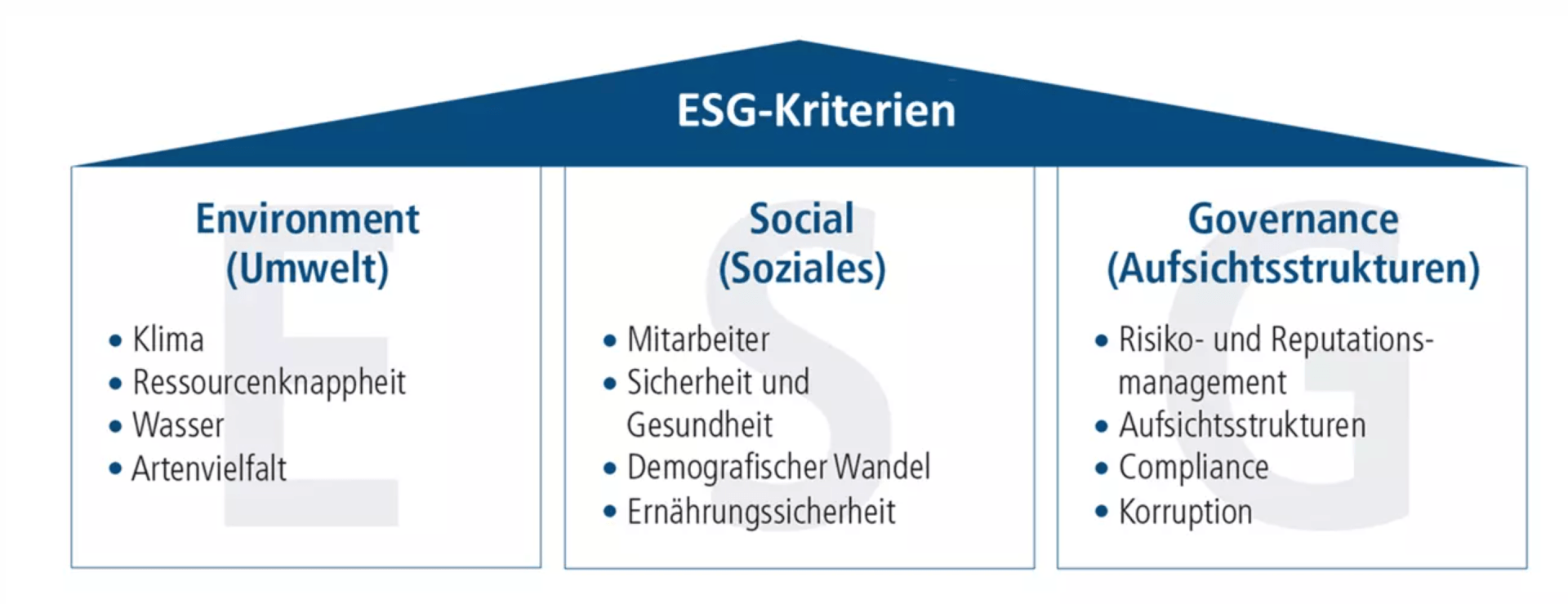 Environmental Social Governance – ESG (zu Deutsch: Umwelt, Soziales und Unternehmensführung) wird als weiter Begriff für CSR (Corporate Social Responsibility) verwendet. Hierbei handelt es sich um die Evaluierung der unternehmerischen Sozialverantwortung.