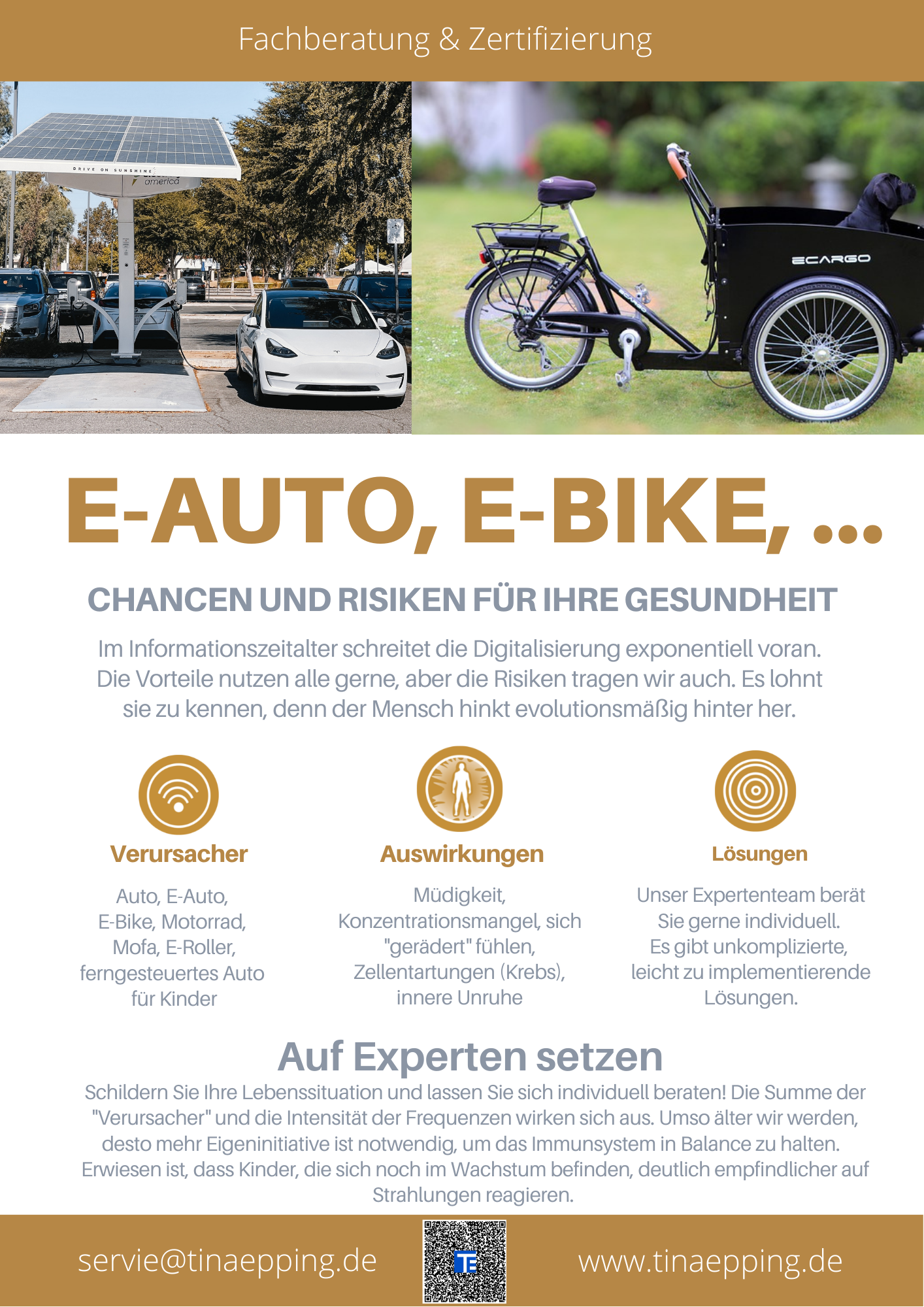 Sie haben sich bestimmt vor Kauf Ihres E-Autos, E-Bikes oder E-Rollers viele Gedanken zu dem Thema gemacht und zahlreiche Informationen gesammelt. In Bezug auf Elektrosmog und seine Auswirkungen sind Verkäufer der Produkte oftmals noch nicht mit aktuellen Informationen versorgt bzw. haben Ihren Fokus auf anderen Themen.