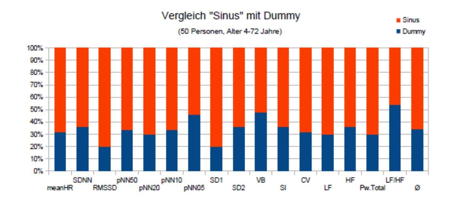 Randomisierte, kontrollierte Doppel-Blindstudie (weder Versuchsleiter noch Teilnehmer hatten Kenntnis über die Gruppenzugehörigkeit und welches Gerät aktuell wirkt/nicht wirkt). Die Teilnehmer mussten zweimal mit ihrem Handy einen Film streamen (anschauen online), somit war das Handy mit voller Funkstärke in der Wirkung. Messungen wurden zweimal durchgeführt mit beiden Geräten. Die Testpersonen wussten nicht, dass es zwei verschiedene (Aktiv/Inaktiv) sinus Body Geräte waren und konnten die beiden Geräte auch nicht unterscheiden. Gemessen wurden; • Mean HR (bpm) … Puls (Schlage pro Minute) • SDNN (ms) … Standardabweichung aller RR- Intervalle. • RMSSD (ms) … Quadratwurzel des quadratischen Mittelwertes der Summe aller Differenzen zwischen • benachbarten RR-Intervallen (RR Intervall = zeitl. Abstand von einem Herzschlag zum nächsten). • pNN50 / pNN20 /pNN10 / pNN05 (%) ... Prozentsatz der Intervalle mit > 50ms / > 20ms >/10ms / >05ms • Abweichung vom vorausgehenden Intervall. • SD1 (ms) … Indikator für die Kurzzeit Variabilität (spontane Variabilität). • SD2 (ms) ... Indikator für die Langzeit Variabilität. Standardabweichung des orthogonalen Abstands • VB (ms) ... Variationsbreite. Die Variationsbreite beschreibt die Breite des Kernbereichs im Histogramm. • Stress Index (SI) … „ein Mas für den Stress“. Ist eine mathematische Beschreibung eines erweiterten • Histogramms der aufgezeichneten RR-Intervalle. • (Seine Höhe gibt an, wie gross der Einfluss des Sympathikus ist, und erlaubt die Beurteilung der • Regulationsfähigkeit des vegetativen Nervensystems).