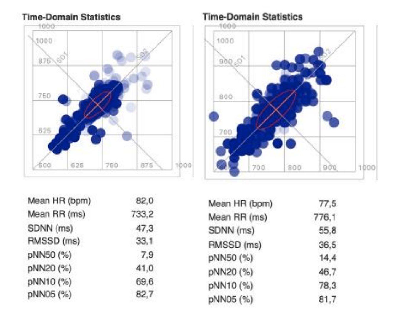 RMMSD-Werte (die eigentliche Herz-Raten-Variabilität) hat sich über die Gruppe positiv verändert. Die dynamischen Werte haben sich erhöht. Die HRV sah trotz Handy-Einsatz mit voller Sendeleistung besser aus als ohne sinus Technologie (sinus Body oder sinus 25)! - SD1-Werte, die spontane Variabilität hat sich nach 5 Min. tragen der i-like sinus Technologie signifikant verbessert.
