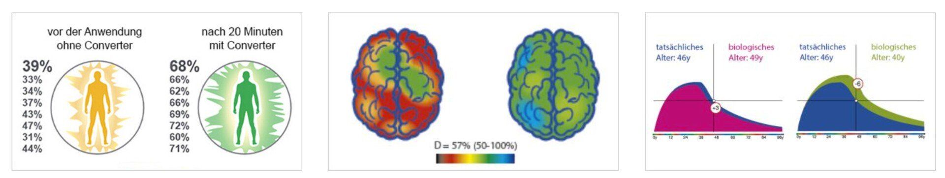 Die gerontologische Kurve zeigt – ohne Converter – als «biologisches Alter» 49 Jahre an, nach 20 Minuten Anwendung des Converters ein solches von 40 Jahren («Verjüngungseffekt»